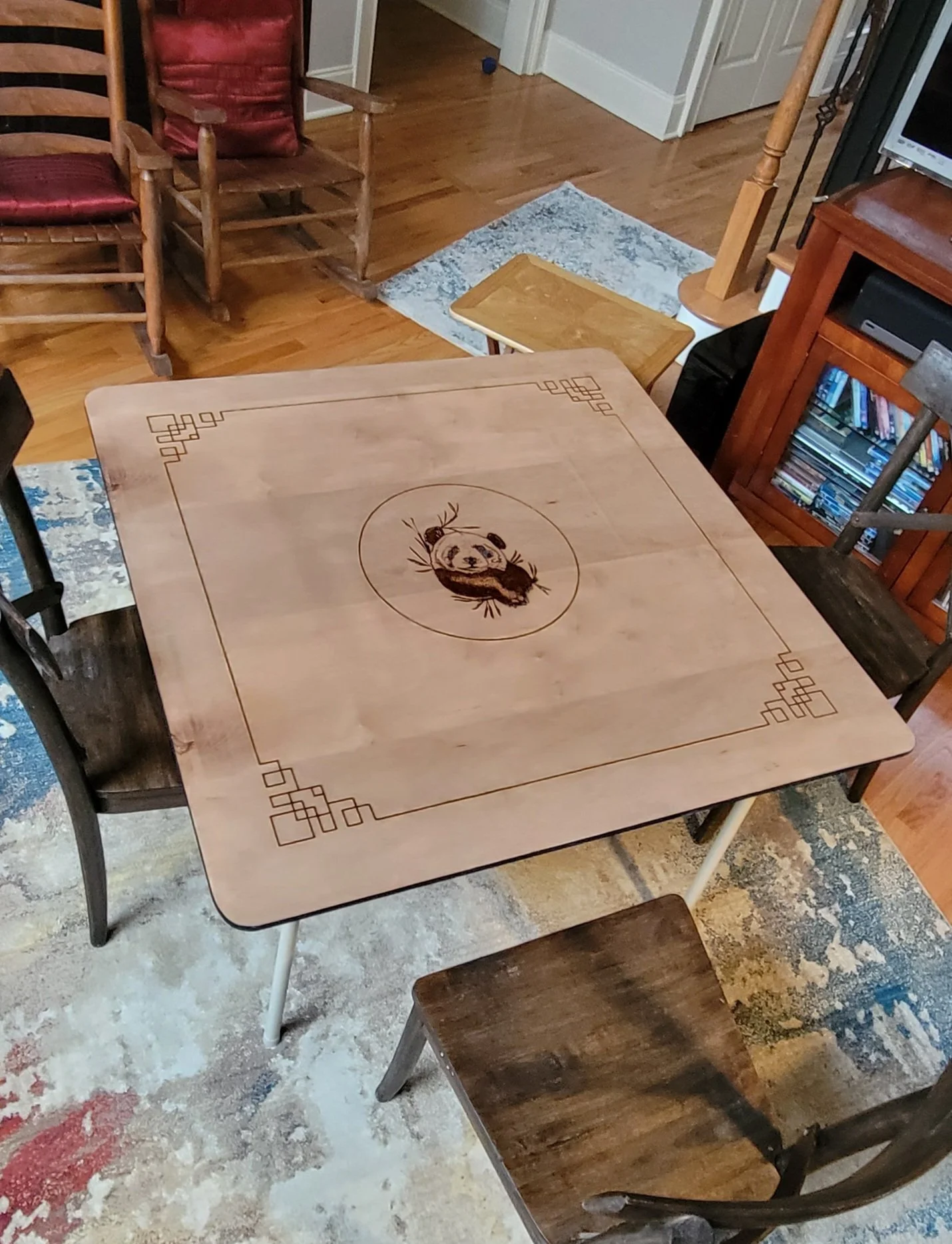 For our first Valentine’s Day, Michael bought me my first wood burning tool from that orange home improvement store that’s on everyone’s main drag. I burned it up in no time. Got the upgrade. That didn’t last either. Finally, got a professional grade system. Yep. You guessed it. I had to decorate my new mahjong table! I put a dragon in the middle, experimented with a different border in each corner, stained it, coated it with polyurethane, and I was ready to go.